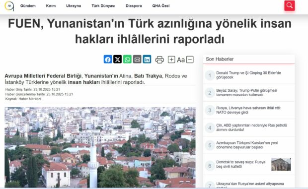• Στην ανάλυση της FUEN, γίνεται λόγος για «παραβιάσεις θεμελιωδών δικαιωμάτων» των «Τούρκων της Δυτικής Θράκης, της Ρόδου και της Κω», με αναφορές σε ζητήματα εκπαίδευσης, θρησκευτικής ελευθερίας και οργάνωσης συλλόγων
