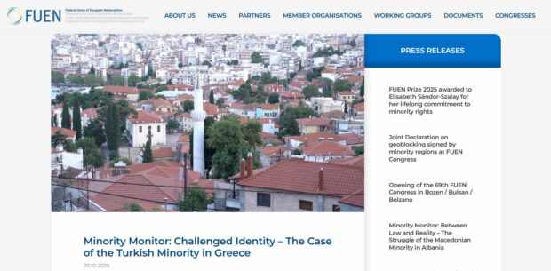 Η FUEN είναι μη κυβερνητικός οργανισμός με έδρα το Φλένσμπουργκ της Γερμανίας. Σύμφωνα με την επίσημη παρουσίασή της, η FUEN αυτοπροσδιορίζεται ως «η μεγαλύτερη ομπρέλα των αυτόχθονων εθνικών και γλωσσικών μειονοτήτων της Ευρώπης», με μέλη σε 38 χώρες και έδρα το Φλένσμπουργκ, το Βερολίνο και τις Βρυξέλλες. Ο ρόλος της είναι συμβουλευτικός και δεν διαθέτει θεσμική εκπροσώπηση σε ευρωπαϊκούς ή διεθνείς οργανισμούς. (FUEN.org, Council of Europe INGO Conference, Συνθήκη της Λωζάννης – άρθρα 37–45).