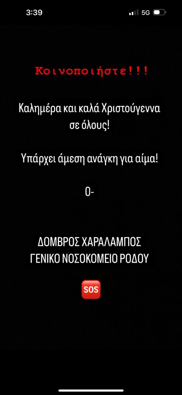 Συγκεκριμένα υπάρχει ανάγκη για αίμα 0-. Ο ασθενής λέγεται Χαράλαμπος Δόμβρος και νοσηλεύεται στο νοσοκομείο της Ρόδου.