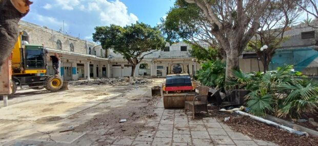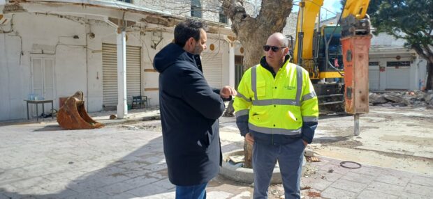 Για την εξέλιξη των εργασιών μίλησε και ο εργολάβος, κ. Κώστας Βρούχος ο οποίος τόνισε ότι οι εργασίες είναι σε εξέλιξη σε δύο μέτωπα: «Το ένα είναι η ανακαίνιση του υπαίθριου χώρου και το δεύτερο αφορά στις εργασίες που γίνονται στον όροφο και αφορούν κυρίως στην ηλεκτρομηχανολογική υποδομή. Όλα θα γίνουν με σύγχρονη τεχνολογία, οπτική ίνα σε κάθε γραφείο κ.λπ. Όλα θα είναι “αφανή” διότι το κυριότερο πρόβλημα που υπήρχε στο μνημείο –εκτός από την καταστροφή του λόγω παλαιότητας- ήταν ότι όλες οι όψεις ήταν γεμάτες καλώδια και εξοπλισμό ο οποίος ήταν κατεστραμμένος».