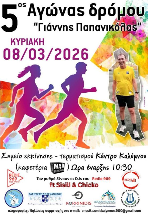 «Το Αθλητικό Σωματείο Ένωση Καζώνης – Κάλυμνος 2000 συνδιοργανώνει με την ΕΑΣ ΣΕΓΑΣ Δωδεκανήσου, τον Δήμο Καλυμνίων και την Περιφέρεια Νοτίου Αιγαίου- Επαρχείο Καλύμνου, αγώνες δρόμου επί δημοσίας οδού με την επωνυμία ‘’Γιάννης Παπανικόλας 2026’’ με του παρακάτω όρους: