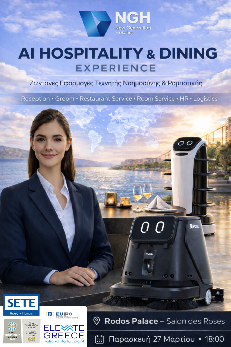 Αύριο, Παρασκευή 27 Μαρτίου, στο ξενοδοχείο Rodos Palace (αίθουσα Salon de Rose), πραγματοποιείται η εκδήλωση «AI Hospitality & Dining Experience», μια στοχευμένη εκδήλωση για την επόμενη ημέρα της φιλοξενίας και της εστίασης, με πρακτικές εφαρμογές τεχνητής νοημοσύνης και ρομποτικής στην καθημερινή λειτουργία των επιχειρήσεων του τουριστικού οικοσυστήματος.