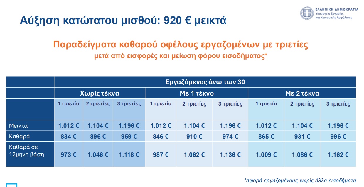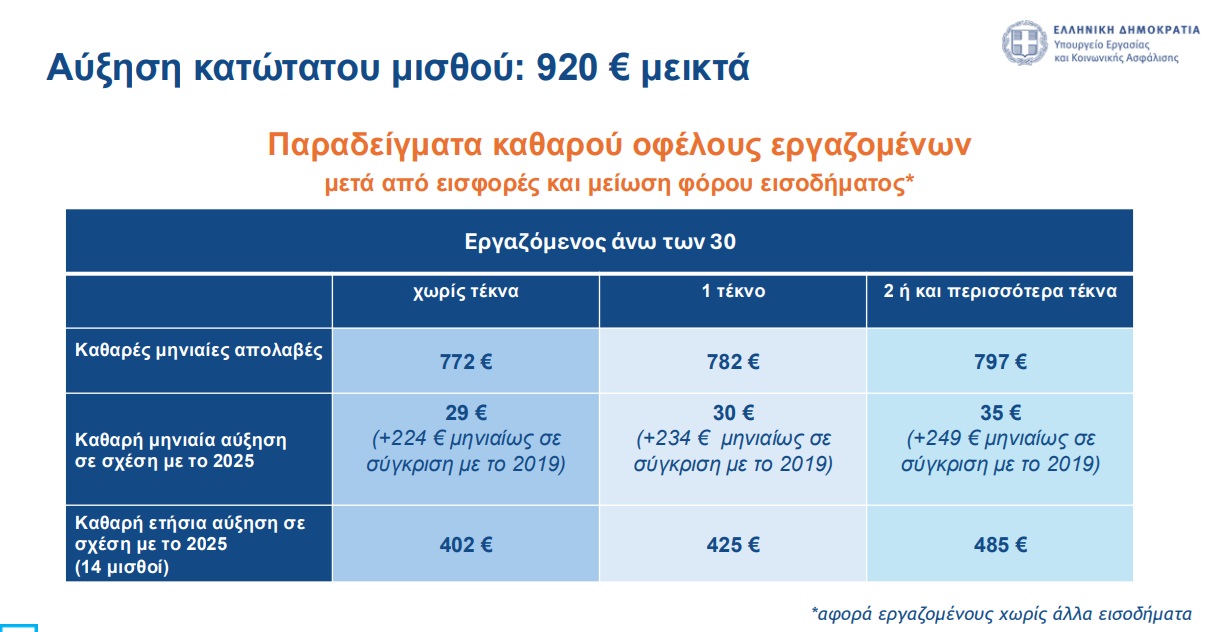 Για εργαζόμενους άνω των 30 ετών, οι καθαρές απολαβές κυμαίνονται από 772 έως 797 ευρώ, ανάλογα με τα προστατευόμενα τέκνα, ενώ η μηνιαία αύξηση κυμαίνεται από 29 έως 35 ευρώ. Σε ετήσια βάση, το όφελος φτάνει έως και τα 485 ευρώ.