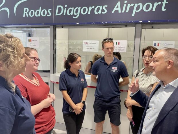Στο αεροδρόμιο της Ρόδου ο Βρετανός Πρέσβης Μάθιου Λοτζ είχε την ευκαιρία να ευχαριστήσει και τα στελέχη του Ελληνικού Υπουργείου Εξωτερικών που ήδη από την Κυριακή έθεσαν σε λειτουργία Γραφείο Εξυπηρέτησης (Help Desk) για τη διευκόλυνση και το συντονισμό της έγκαιρης αναχώρησης πολιτών ξένων χωρών οι οποίοι έχουν απωλέσει τα ταξιδιωτικά τους έγγραφα. Σ’ αυτό τους το έργο είχαν και τη συνεργασία της βρετανικής πλευράς, του έμπειρου προσωπικού του Βρετανικού Προξενείου στη Ρόδο και ειδικού κλιμακίου του Βρετανικού Υπουργείου Εξωτερικών που βρέθηκε στο νησί γι’ αυτό το σκοπό.
