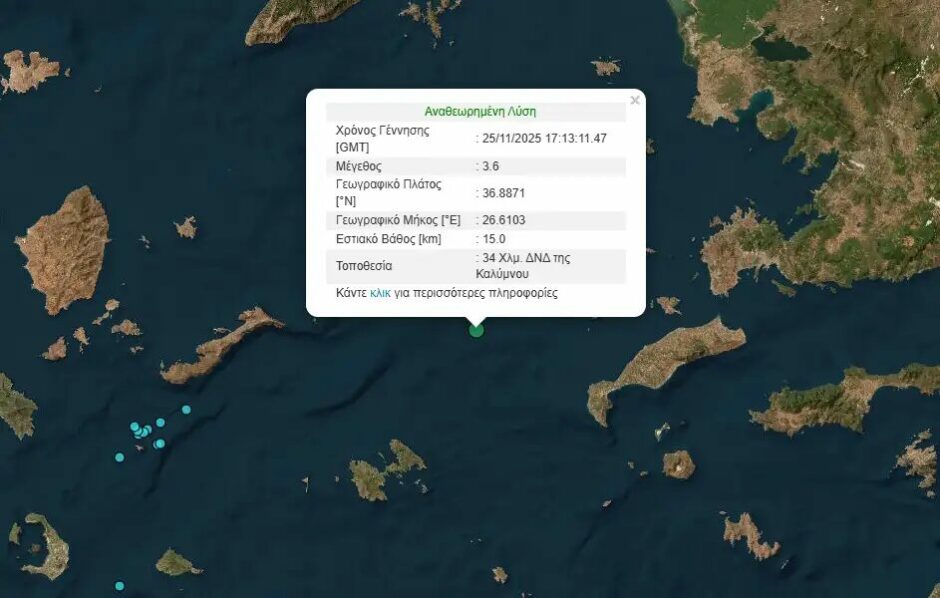 Σεισμός μεγέθους 3,6 βαθμών της κλίμακας Ρίχτερ σημειώθηκε στην Κάλυμνο στις 7:13 το απόγευμα της Τρίτης (25.11.2025).