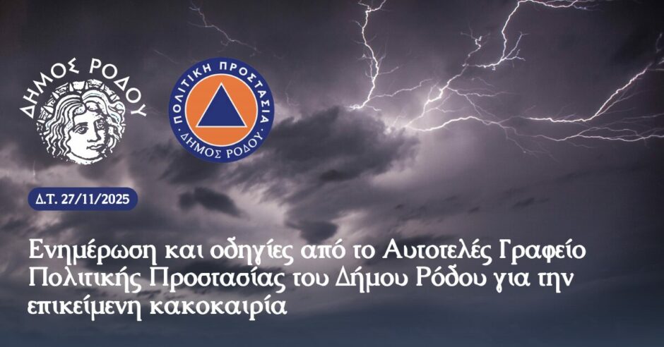 Ενημέρωση και οδηγίες από το Αυτοτελές Γραφείο Πολιτικής Προστασίας του Δήμου Ρόδου για την επικείμενη κακοκαιρία