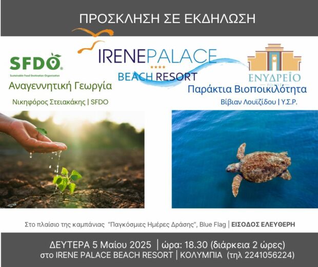 Στο Irene Palace Beach Resort θα πραγματοποιηθεί εκδήλωση για την προστασία της βιοποικιλότητας στο πλαίσιο της Διεθνούς Καμπάνιας «Παγκόσμιες Ημέρες Δράσης», με έμφαση στην αναγεννητική γεωργία και τα θαλάσσια οικοσυστήματα, τη Δευτέρα 5 Μαίου στα Κολύμπια στις 18.30 (διάρκεια 2 ώρες), στην αίθουσα εκδηλώσεων.