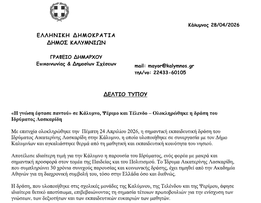 Δείτε το δελτίο τύπου του Δήμου Καλυμνίων: