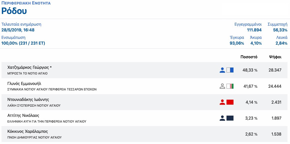 O Γιώργος Χατζημάρκος και η παράταξη «Μπροστά το Νότιο Αιγαίο» επικρατεί με 19,77 μονάδες διαφορά (ποσοστό 53,56%) έναντι του κυρίου αντιπάλου του Εμμανουήλ Γλυνού και της παράταξης «Συμμαχία Νοτίου Αιγαίου» (ποσοστό 33,79%) με καταμετρημένα τα 702 από τα 718 εκλογικά τμήματα στο Νότιο Αιγαίο.