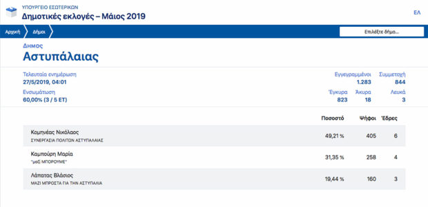 Στην Αστυπάλαια με ενσωμάτωση 60% ο κ. Νίκος Κομνηνέας είχε ποσοστό 49,21% και 405 ψήφους και η κ. Μαρία Καμπούρη με ποσοστό 31,35% και 258 ψήφους. Ο κ. Βλάσης Λαπατάς συγκεντρώνει ποσοστό 19,44%)