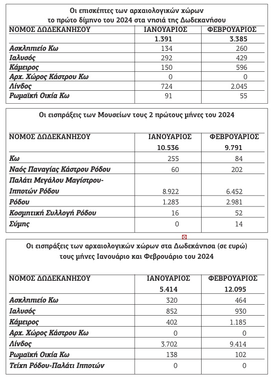 Από την έρευνα παραθέτουμε τα αναλυτικά στοιχεία για το πρώτο δίμηνο του 2024, παρότι δεν είχε ξεκινήσει ακόμη η τουριστική σεζόν, στα μουσεία και τους αρχαιολογικούς χώρους της Δωδεκανήσου.