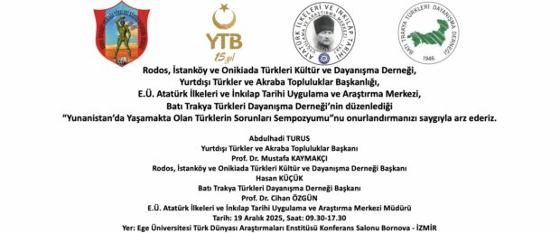 Η εκδήλωση, με τίτλο «Τα προβλήματα των Τούρκων που ζουν στην Ελλάδα», πραγματοποιείται στο Ege Üniversitesi της Σμύρνης και συνδιοργανώνεται από την Υπηρεσία Τούρκων του Εξωτερικού (YTB), το Εφαρμοσμένο και Ερευνητικό Κέντρο Αρχών και Ιστορίας των Μεταρρυθμίσεων του Ατατούρκ του Ege Üniversitesi, το σωματείο ROİSDER (Σύλλογος Τούρκων Ρόδου, Κω και Δωδεκανήσων) και τον Σύλλογο Αλληλεγγύης Τούρκων Δυτικής Θράκης.