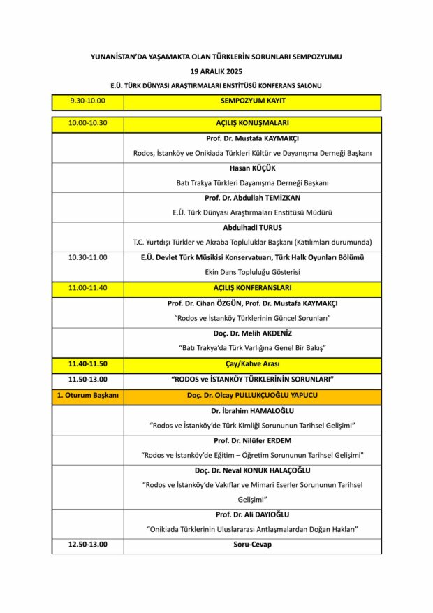 • Το συνέδριο που προγραμματίζεται για τις 19 Δεκεμβρίου στη Σμύρνη φέρνει τη Ρόδο και την Κω στο επίκεντρο της συζήτησης • Πραγματοποιείται στο Ege Üniversitesi της Σμύρνης και συνδιοργανώνεται από την Υπηρεσία Τούρκων του Εξωτερικού, το Ινστιτούτο Ερευνών του Τουρκικού Κόσμου, το σωματείο ROİSDER (Σύλλογος Τούρκων Ρόδου, Κω και Δωδεκανήσων) και τον Σύλλογο Αλληλεγγύης Τούρκων Δυτικής Θράκης