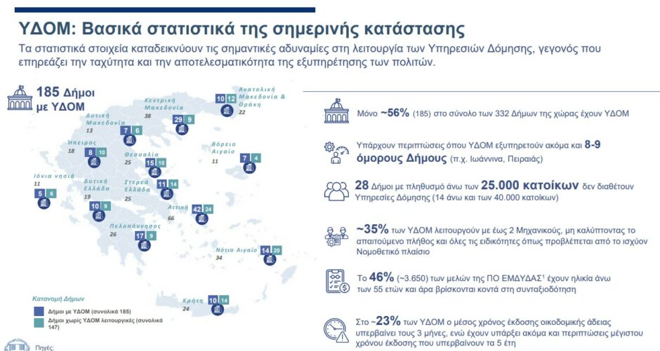Σύμφωνα με τα στοιχεία, μόνο 185 δήμοι διαθέτουν Υπηρεσία Δόμησης, ενώ περίπου το 35% των υφιστάμενων ΥΔΟΜ λειτουργεί με δύο ή και λιγότερους μηχανικούς, αριθμό που δεν επαρκεί για την κάλυψη όλων των ειδικοτήτων που απαιτεί η πολεοδομική νομοθεσία.