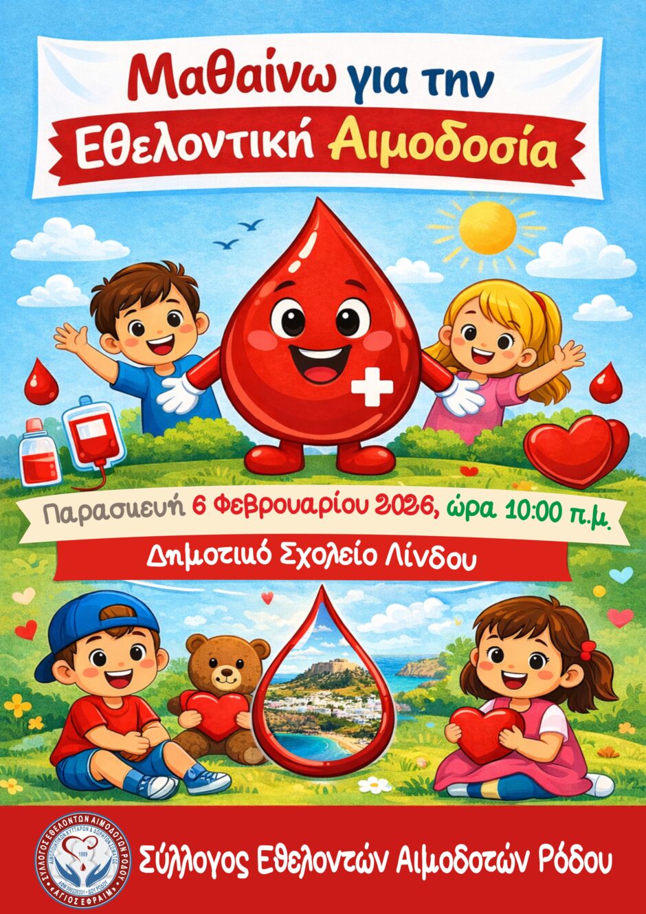 Την Παρασκευή 6 Φεβρουαρίου 2026, στις 10:00 το πρωί, θα πραγματοποιηθεί ενημέρωση των μαθητών στο Δημοτικό Σχολείο Λίνδου, σε μια δράση που φιλοδοξεί να φυτέψει τον σπόρο της προσφοράς και της αγάπης για τον άνθρωπο.