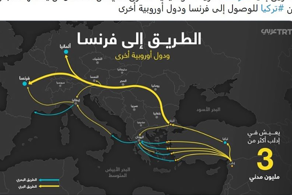 Χάρτη με τις διαδρομές που πρέπει να ακολουθήσουν οι παράνομοι μετανάστες για να μεταβούν στην Ελλάδα και από εκεί σε άλλες ευρωπαϊκές χώρες, ανάρτησε στον αραβόφωνο λογαριασμό του στο Twitter το τουρκικό κρατικό κανάλι TRT.