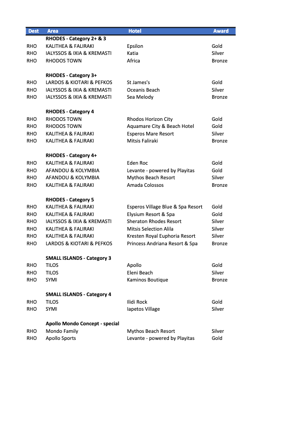 «Πρόκειται για έναν ετήσιο θεσμό όπου βραβεύονται τα ξενοδοχεία τα οποία διακρίθηκαν -βάσει των ερωτηματολογίων των πελατών της Apollo. Έχει αρκετά υψηλά standards μέσα από τα οποία, βλέπουμε ότι η Ρόδος “σκοράρει” σε υψηλά επίπεδα σε σχέση με άλλους προορισμούς στη Μεσόγειο. Είναι ένας θεσμός, ο οποίος σίγουρα βοηθάει να αναδειχθούν κάποια στοιχεία καθώς και τις συνεχείς επενδύσεις των ξενοδοχείων με έμφαση στην ποιότητα με το προσωπικό. Αυτό, αποτελεί και ένα κίνητρο για να βελτιώνονται τα συνεργαζόμενα ξενοδοχεία. Επιπλέον, βοηθάει στην προώθησή τους, διότι εάν είναι βραβευμένα, αυτό φαίνεται στον πελάτη. Είναι δηλαδή, μία επικύρωση της καλής δουλειάς που έγινε την περασμένη σεζόν στο συνεργαζόμενο ξενοδοχείο…».