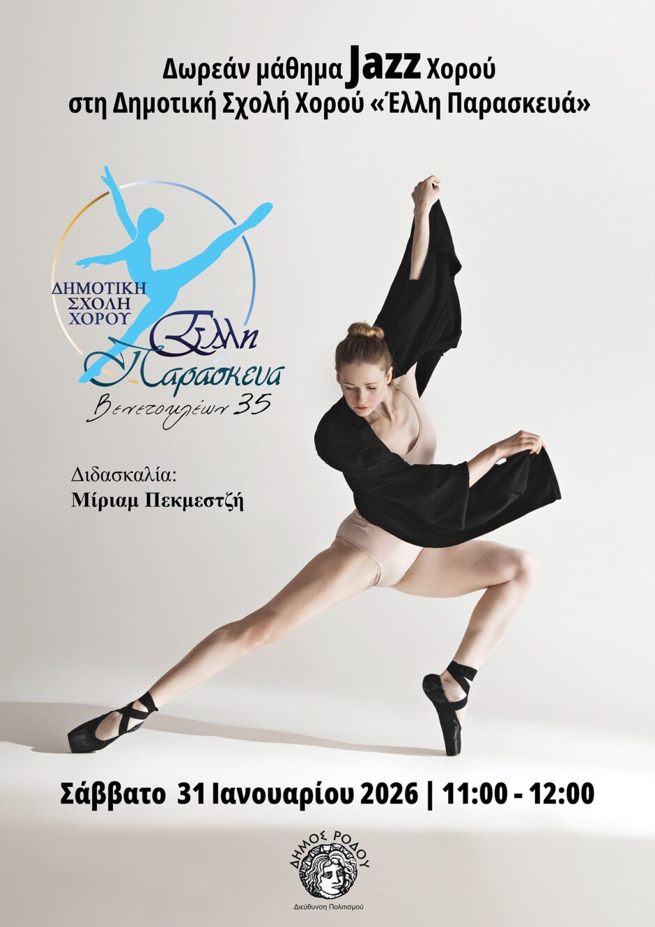Η Διεύθυνση Πολιτισμού του Δήμου Ρόδου ανακοινώνει ότι, το Σάββατο 31/01/2026 στις 11.00 -12.00 π.μ., θα πραγματοποιηθεί δωρεάν μάθημα Jazz Χορού στη Δημοτική Σχολή Χορού «Έλλη Παρασκευά».