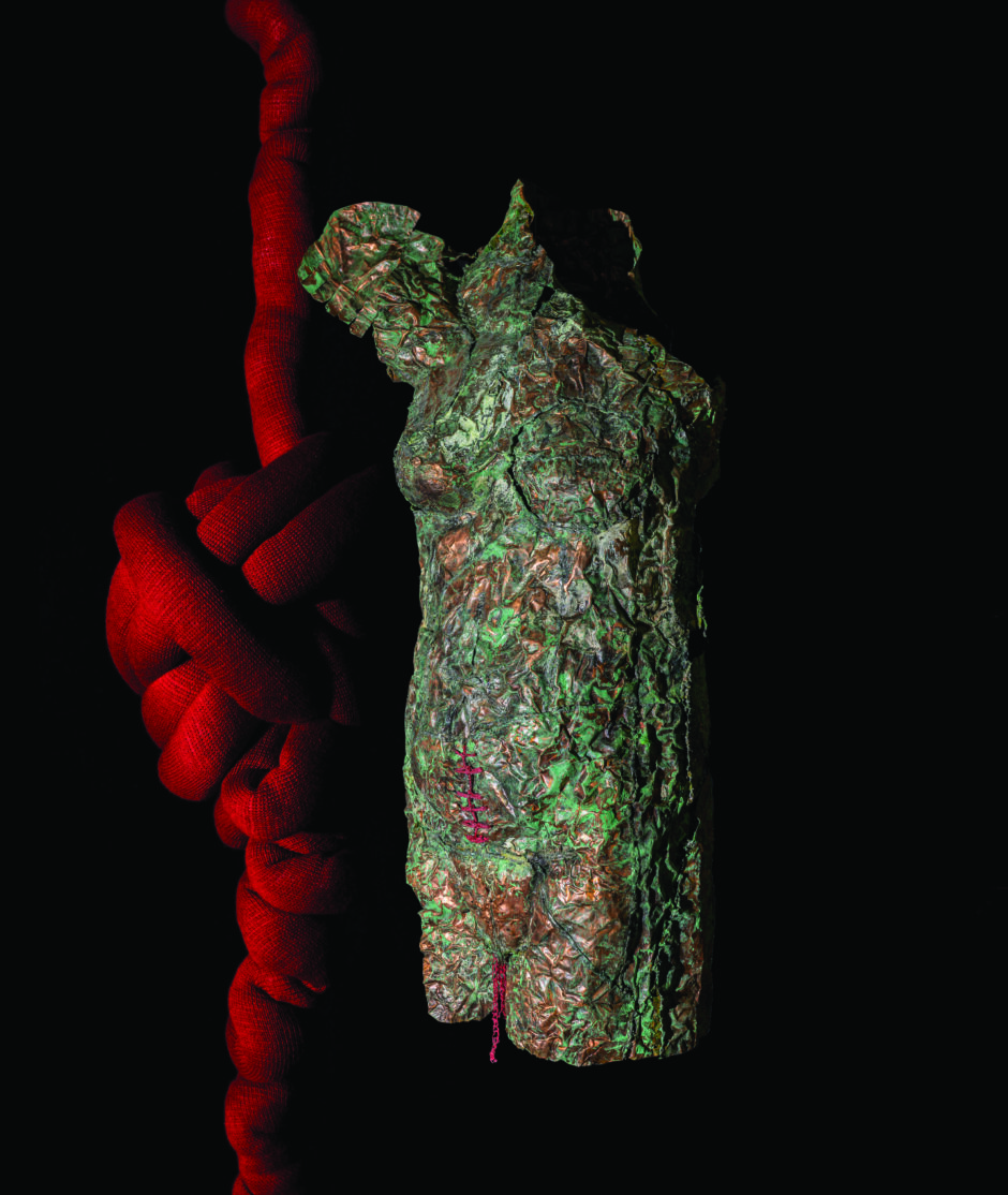 «Η θηλυκότητα, ως πεδίο μιας ιστορικά ατέρμονης διαπραγμάτευσης για χειραφέτηση και αυτοδιάθεση. Το γυναικείο σώμα, ως ένας κατεξοχήν πολιτικός τόπος όπου εγγράφονται σχέσεις εξουσίας, κοινωνικές νόρμες, έμφυλες ιεραρχίες και πολιτισμικές επιταγές. Ίχνη οδύνης και επιβίωσης, καταπίεσης και σθένους, μαρτυρίας και διαμαρτυρίας. Όλα συμπλέκονται στο No Excuse#2 της Ειρήνης Βαζούκου, η οποία επανέρχεται και επεκτείνει την πολυετή έρευνά της γύρω από τις διαθεματικές διακρίσεις κατά της γυναικείας ταυτότητας -διακρίσεις ταξικές, φυλετικές, ηλικιακές, σεξουαλικού προσανατολισμού, κ.α. Η καλλιτεχνική της φόρμουλα μετασχηματίζεται δυναμικά ανάλογα με το εννοιολογικό φορτίο και την αισθητική της αναζήτηση: από την αμεσότητα της ζωγραφικής χειρονομίας έως την τριδιάστατη υλικότητα των κατασκευών και των εγκαταστάσεων. Μέσα από αυτή την πολυφωνία μέσων, η Βαζούκου καρφώνει το βλέμμα της στον πατριαρχικό “κανόνα” και την αντικειμενοποίηση. Χαρτογραφεί, με συμβολισμούς πολύσημους, την ανατομία των μηχανισμών παραγωγής και ελέγχου της γυναικείας εμπειρίας. Αποδομώντας τις κυρίαρχες αφηγήσεις για την “ενσωματωμένη” θηλυκότητα, δημιουργεί έναν χώρο όπου ο θεατής καλείται να αντιμετωπίσει το τραύμα ως πεδίο συλλογικής ευθύνης. Με το NoExcuse#2, η Βαζούκου συμβάλλει δημιουργικά στον διάλογο για την κοινωνική δικαιοσύνη, καθιστώντας ορατές τις αθέατες πτυχές της κακοποίησης και της έμφυλης βίας, αφήνοντας ταυτόχρονα το έργο της ανοιχτό σε πολλαπλές, συχνά λυτρωτικές, αναγνώσεις».