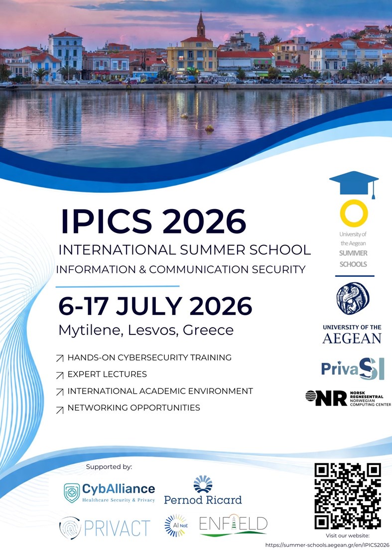 Το Διεθνές Θερινό Σχολείο “Ασφάλεια Πληροφοριακών και Επικοινωνιακών Συστημάτων – IPICS2026” αποτελεί ένα διεθνές εκπαιδευτικό πρόγραμμα δύο εβδομάδων, το οποίο διοργανώνεται στο πλαίσιο της συμμετοχής του Πανεπιστημίου Αιγαίου στο Δίκτυο IPICS-Intensive Programme on Information and Communication Security. Τα τελευταία 20 χρόνια το IPICS έχει καθιερωθεί στη διεθνή ακαδημαϊκή κοινότητα ως «Τhe Academic European School on ICT security», δηλαδή ως ένα από τα πιο αξιόλογα ακαδημαϊκά ευρωπαϊκά σχολεία στην Ασφάλεια των Τεχνολογιών Πληροφορικής και Επικοινωνιών.