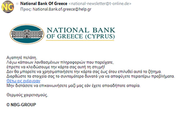 Τεράστια αναστάτωση σε δεκάδες πελάτες της Εθνικής Τράπεζας στη Ρόδο έχουν προκαλέσει τις τελευταίες ημέρες ψεύτικα mails που ενημερώνουν τους παραλήπτες ότι δήθεν κλειδώθηκε η κάρτα τους, λόγω λανθασμένων πληροφοριών.