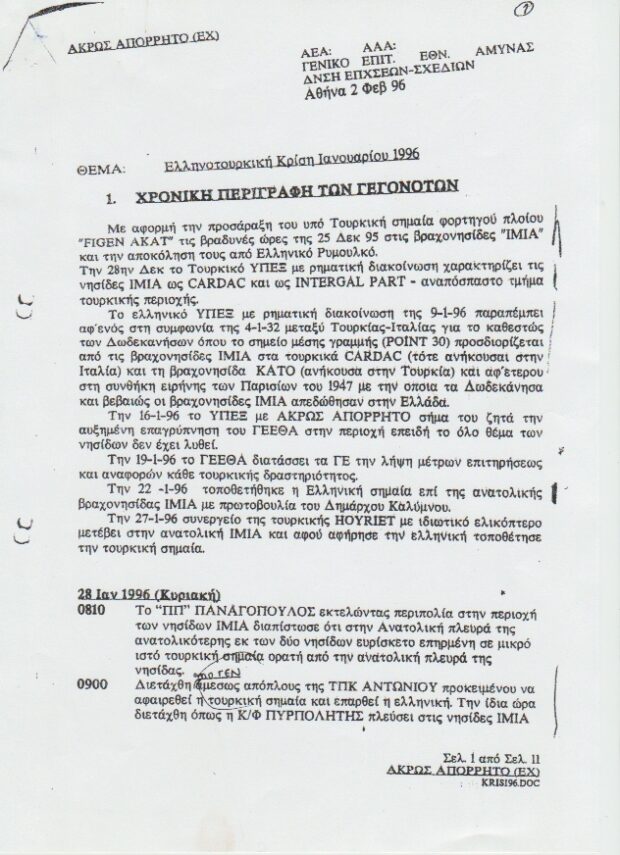 Ένα άκρως απόρρητο έγγραφο του Γενικού Επιτελείου Εθνικής Αμυνας, που συντάχθηκε στις 2 Φεβρουαρίου 1996, μία ημέρα μετά τη νύχτα των Ιμίων, περιγράφει λεπτό προς λεπτό την εξέλιξη της κρίσης και φωτίζει τα πρόσωπα, τις αποφάσεις και τα γεγονότα εκείνες τις κρίσιμες ώρες. Η κρίση άρχισε να λαμβάνει σοβαρές διαστάσεις στις 22 Ιανουαρίου 1996, την ίδια ημέρα που ο Κώστας Σημίτης εξελέγη πρωθυπουργός από την Κοινοβουλευτική Ομάδα του ΠΑΣΟΚ.