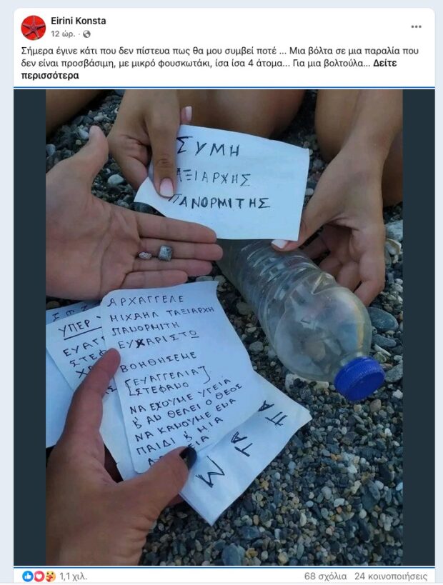 Κεντρικό στοιχείο της υπόθεσης είναι η ανάρτηση της κ. Ειρήνης Κώνστα, η οποία περιγράφει με έντονη προσωπική φόρτιση την εμπειρία και κυρίως την απόφαση να βοηθήσει ώστε το μπουκάλι να φτάσει στον Πανορμίτη. Το κείμενο λειτουργεί σαν γέφυρα ανάμεσα σε μια άγνωστη γυναίκα που έστειλε το τάμα της στη θάλασσα και σε ανθρώπους που το εντόπισαν και επέλεξαν να το σεβαστούν.