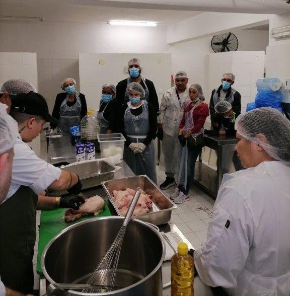 Προετοιμασία & Οργάνωση: Οι συμμετέχοντες εκπαιδεύτηκαν στη συσκευασία μερίδων φαγητού για δομές συσσιτίου και στις διαδικασίες καθαρισμού και λάντζας, που αποτελούν τη βάση λειτουργίας κάθε επαγγελματικής κουζίνας υπό την καθοδήγηση του σεφ της Δομής Συσσιτίου Αποστόλη Τσαμπίκου Πονιά. Ιδιαίτερα συγκινητική υπήρξε η αλληλεπίδραση μεταξύ των μαθητών και των συμμετεχόντων Ρομά.
