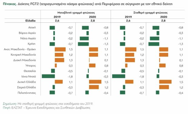 Αυτό προκύπτει από την νέα ανάλυση που δημοσίευσαν η διαΝΕΟσις και το Παρατηρητήριο Περιφερειακών Πολιτικών, γύρω από την περιφερειακή διάσταση της εισοδηματικής φτώχειας στην Ελλάδα.