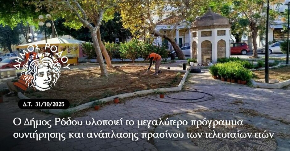 Ο Δήμος Ρόδου, μέσω της Διεύθυνσης Περιβάλλοντος και Πρασίνου, προχώρησε στην υλοποίηση της νέας εργολαβίας καθαρισμού, ανανέωσης και φύτευσης πρασίνου σε διάφορα σημεία της πόλης, με στόχο τη βελτίωση της εικόνας, την ενίσχυση του αστικού πρασίνου και τη βελτίωση της ποιότητας ζωής των πολιτών.