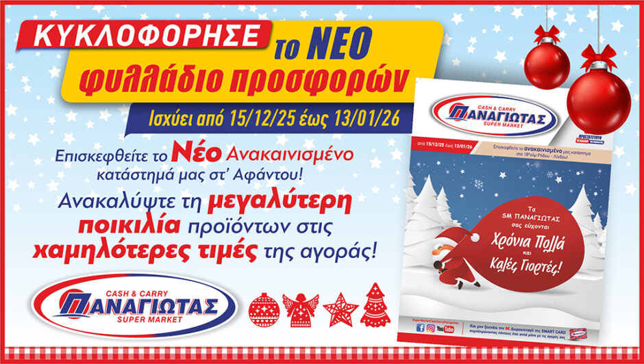 Η μαγεία των Χριστουγέννων ξεκινά από το τραπέζι! Τα Super Market ΠΑΝΑΓΙΩΤΑΣ σας προσκαλούν σε ένα γαστρονομικό ταξίδι ποιότητας, ποικιλίας και απίθανων τιμών, για να ...