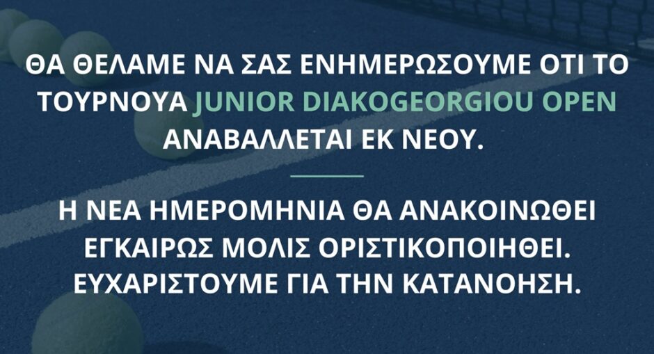 Ο Ροδιακός Όμιλος Αντισφαίρισης ενημέρωσε ότι το τουρνουά «Junior Diakogeorgiou Open Cup» που θα γινόταν στις εγκαταστάσεις του, αναβάλλεται εκ νέου μέχρι νεωτέρας. Αξίζει να ...