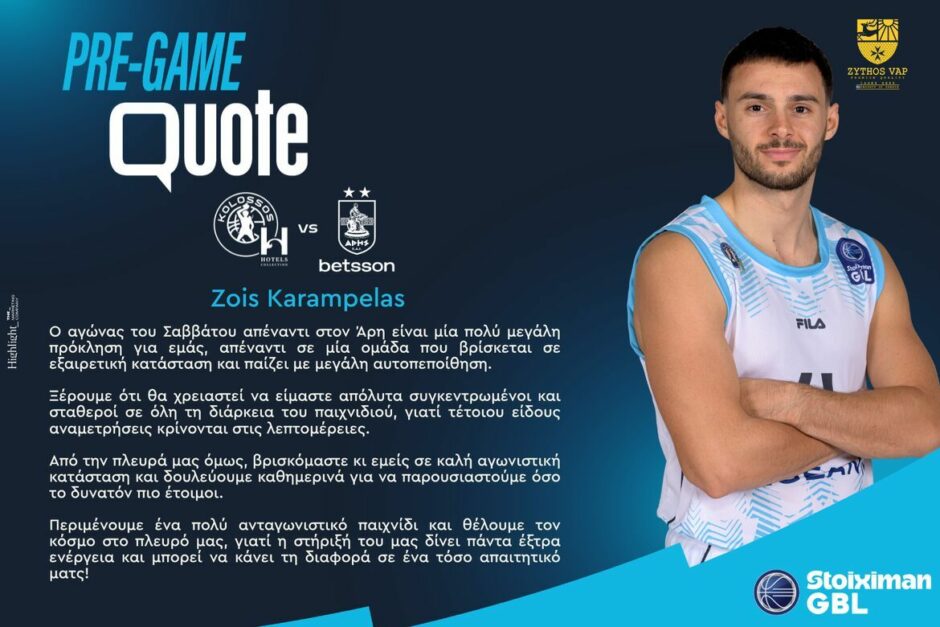 Την άποψή του για την εντός έδρας αναμέτρηση του Κολοσσού απέναντι στον Άρη (Σάββατο 16:00), για τη 23η αγωνιστική της GBL, μοιράστηκε ο Ζώης Καράμπελας. Οι δηλώσεις του Έλληνα πόιντ-γκαρντ: ...